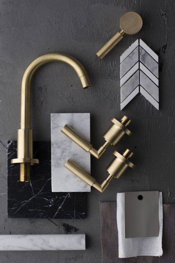 Rivestimento in marmo effetto Chevron, Lavabo Freestanding in vetro @antoniolupidesign , box doccia in ottone e Luci Vintage